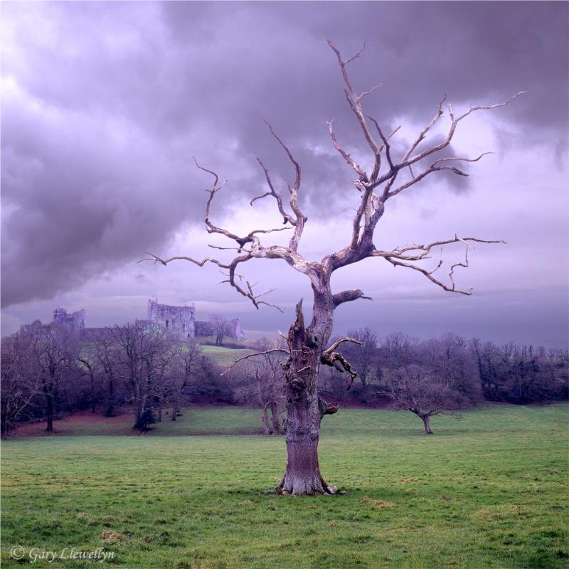 "Situated in the grounds of Llansteffan Mansion an old rotten tree stands defiant. The scene is overlooked by Llansteffan Castle which once stood as an act of Norman defiance against Llywelyn the Great. The impressive castle, dramatically sited on a hilltop high above the river Tywi was initially an Iron Age hill fort dating back to the 6th century B.C, its double ditch is still visible in places. The castle has passed through many hands through the ages from Welsh to Norman. The castle is currently maintained by CADW."