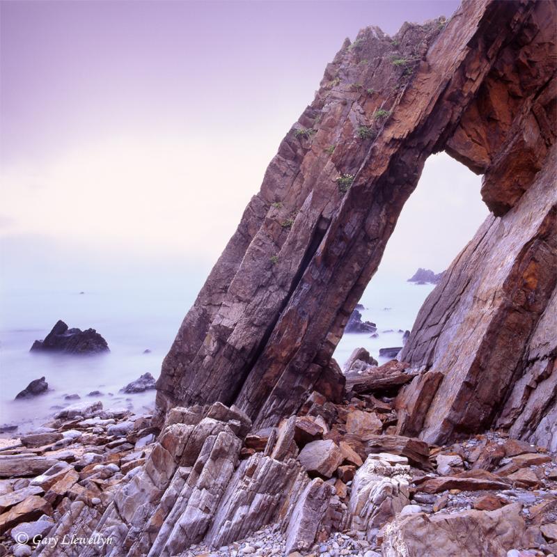 "This Image was taken one evening in June 2008 as sea fog rolled in. The gentle diffused light exposed the rocks and sea beautifully creating a softness rarely encountered. The arch was in part formed by a geological feature known as an 'Anticline'. This is where the earth's surface has previously been folded to form a convex arch under immense pressures at plate margins. The bands of rock are subsequently left plunging near vertical, with the oldest rocks found progressively towards the centre. Since taking this image the arch has completely collapsed, leaving a small stump at the base."